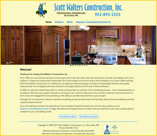 Scott Walters Construction, Inc. is a Burnsville based building contractor that specializes in custom kitchen and bathroom remodeling. They've been a Troutreach client since we built their first website in 2009. We replaced that site in 2017 with a new, freshly designed website built using Drupal 7. This new website is fully responsive and performs well on devices ranging from small smartphone screens to large 4K and 5K monitors.